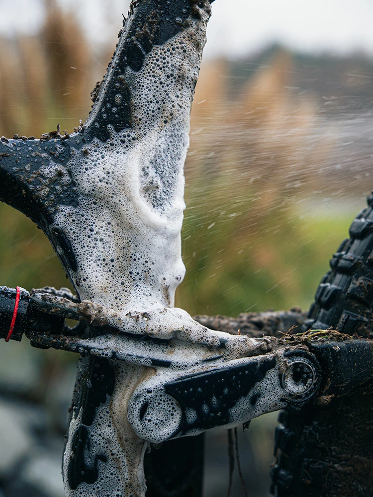 - Vaporiser le vélo, laisser agir le produit pendant 5 à 10 minutes, puis rincer abondamment avec un jet d’eau puissant (pas de haute pression !).