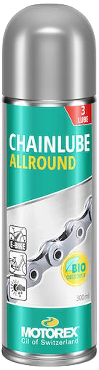 MOTOREX CHAINLUBE ALLROUND est un lubrifiant spécial pour chaînes doté d’une très longue durée de vie qui satisfait ainsi aux exigences de l’utilisation quotidienne. Il protège la chaîne et le dérailleur contre la corrosion et l’oxydation tout en réduisant l’usure. Les bruits de chaîne et les frottements sont réduits de manière durable. Optimal pour les vélos mécaniques et électriques soumis à un emploi quotidien.