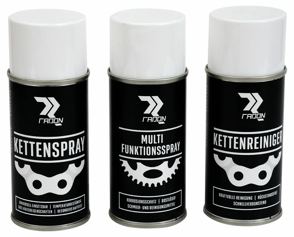 Lespray pour chaînes RADON est un produit d’entretien pour chaînes très résistant et réduisant l’usure. Il s’applique facilement, convient à toutes les conditions météorologiques et est adhérent, c’est pourquoi il ne goutte pas, même en cas de rotation rapide. La capacité élevée de fluage et de pénétration dans les articulations de la chaîne réduit l’énergie d’entraînement nécessaire. Le faible coefficient de frottement y contribue également. Le spray pour chaînes RADON forme un film lubrifiant transparent et incolore et protège contre la corrosion.