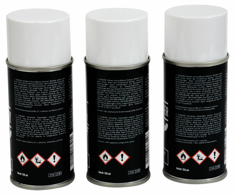 Aérosol extrêmement inflammable. Le récipient est sous pression : peut éclater en cas d’échauffement. Provoque une irritation de la peau. Peut provoquer somnolence et vertiges. Toxique pour les organismes aquatiques, entraîne des effets néfastes à long terme. Tenir hors de portée des enfants. Tenir à l’écart de la chaleur, des surfaces chaudes, des étincelles, des flammes nues et de toute autre source d’inflammation. Ne pas fumer. Ne pas vaporiser vers une flamme nue ou une autre source d’inflammation. Ne pas percer ou brûler, même après utilisation. EN CAS DE CONTACT AVEC LA PEAU : Laver abondamment à l’eau et au savon. EN CAS D’INHALATION : Transporter la personne à l’air frais et lui permettre de respirer librement. Protéger des rayons du soleil. Ne pas exposer à des températures supérieures à 50 °C/122 °F